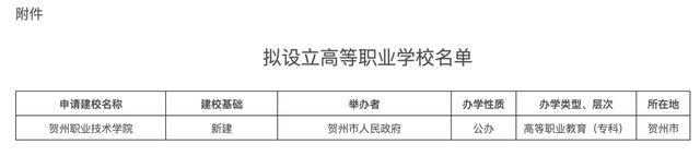 公示信息显示,拟设立公办专科层次高职院校贺州职业技术学院,举办者为贺州市人民政府。