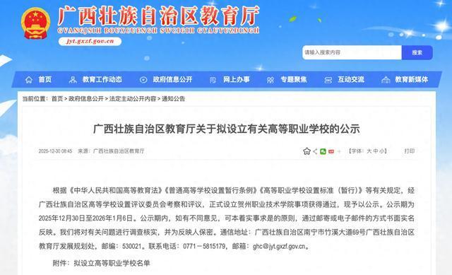 12月30日,广西壮族自治区教育厅发布《广西壮族自治区教育厅关于拟设立有关高等职业学校的公示》。