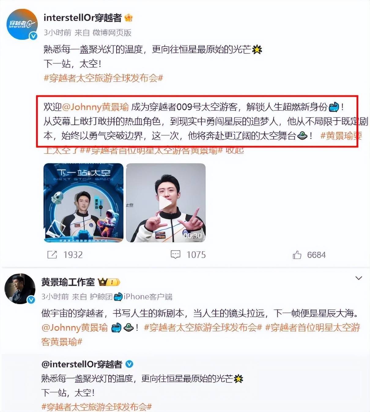 而如今的黄景瑜更是再度实现了身份上的一大突破,成为了首批太空旅客。