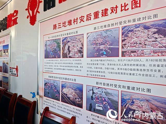路三圪堆村灾后重建指挥部内的重建对比图。人民网记者 刘艺琳摄