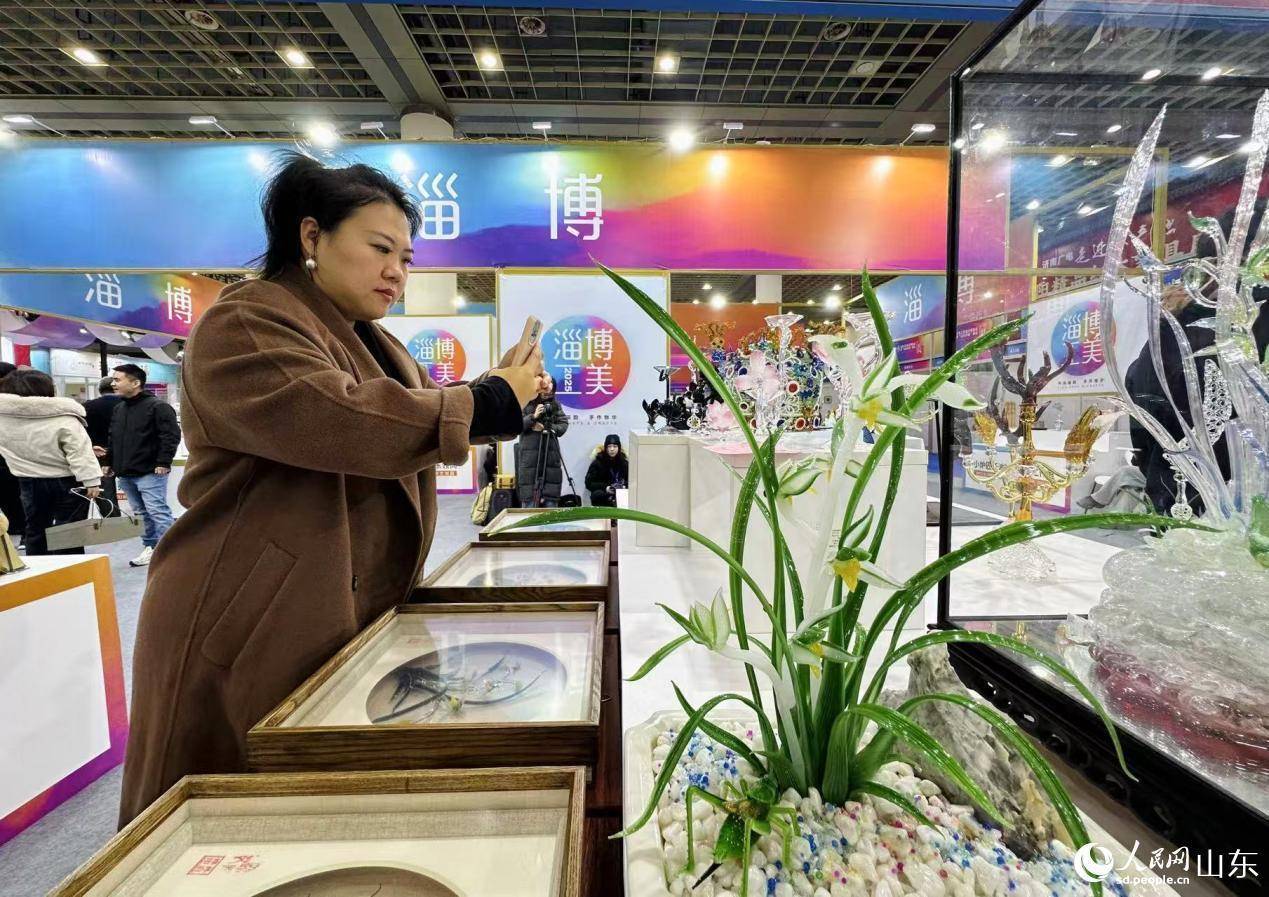 参展者在淄博琉璃展台前拍照。人民网记者 乔姝摄