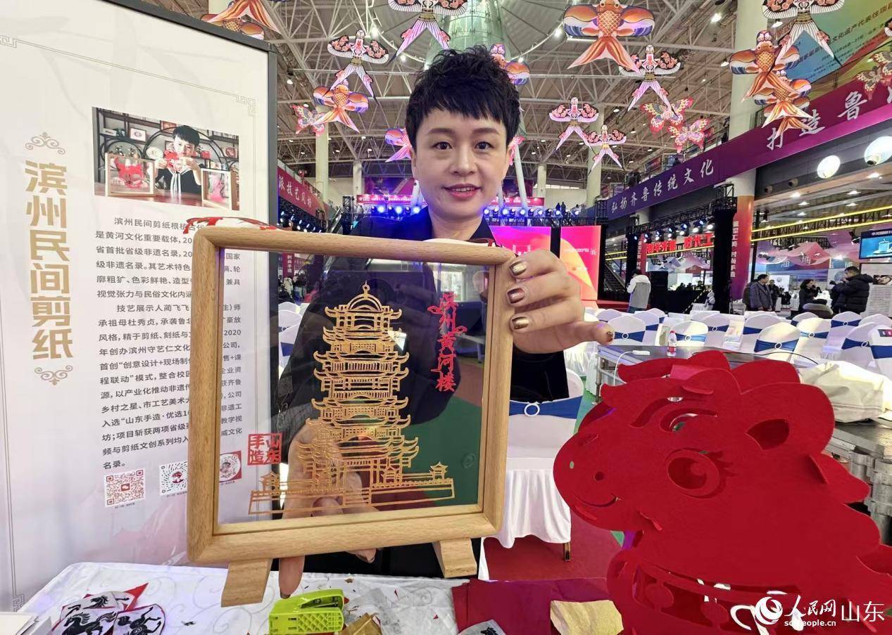滨州民间剪纸技艺展示人现场展示剪纸作品。人民网记者 乔姝摄
