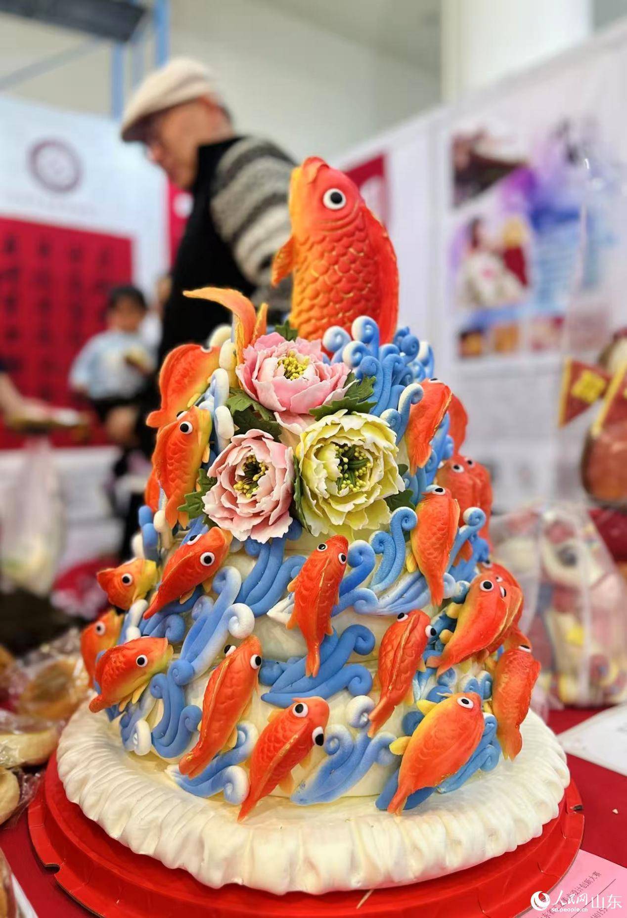 “荷花杯”山东省工艺美术设计创新大赛面塑作品《吉庆有余》。人民网记者 乔姝摄