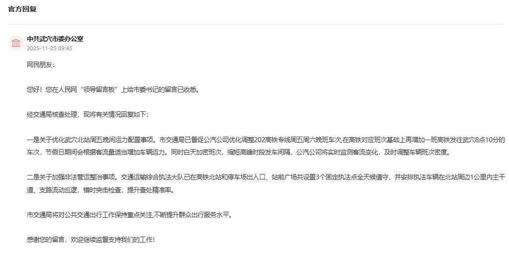 对此,武穴市委办公室在回复中表示,公共交通是民生出行的重要保障。市交通局已对网民反映的问题进行了核查处理,并采取了针对性措施。武穴市委办公室介绍,该市已着手从两方面推进问题解决:一是迅速优化运力配置,督促公汽公司优化调整202高铁专线周五周六晚班车次,在高铁对应班次基础上,再增加一班晚上8点10分从高铁站发往武穴城区的车次,并承诺在节假日期间根据客流量动态调配运力,同时加密白天班次、缩短发车间隔,以实时响应客流变化;二是强化非法营运整治,交通运输综合执法大队已在武穴北站区域设置多个固定执法点全天候值守,并安排执法车辆在站点周边开展流动巡逻与错时突击检查,提升查处精准率,持续净化客运环境。
